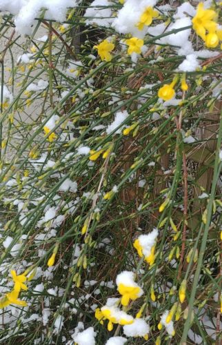 Gelb leuchten die Blüten von Winterjasmin und Zaubernuss. Während der Winterjasmin sehr robust ist, gilt die empfindliche Hamamelis als “Königin der Winterblüher”, immerhin sie muss nicht verschnitten werden
