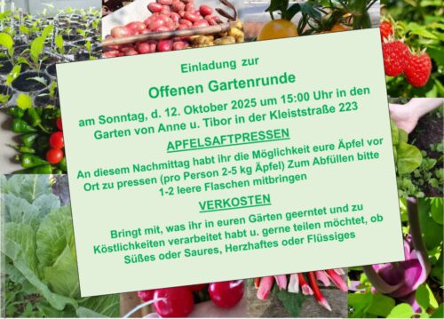 Wir treffen uns am 12. Oktober um 15:00 Uhr im Garten von Anne und Tibor in der Kleiststraße 223.
