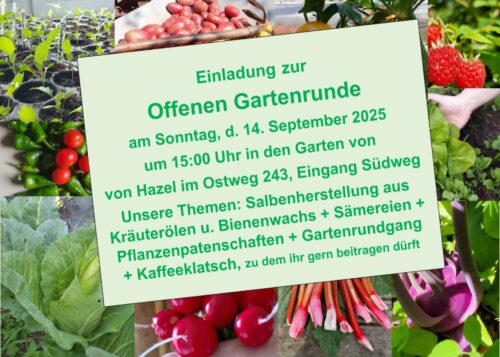 der September steht vor der Tür und somit eine neue Gartenrunde. Wir sind am 14.09. um 15:00 Uhr in Hazels Garten zu Gast und werden durch Cordula und Hazel in das Geheimnis der Herstellung von Salben aus Kräuterölen und Bienenwachs eingeweiht. Es wird wieder einen Gartenrundgang geben und Hazel wird Sämereien und Pflanzenpatenschaften anbieten. Und damit es an diesem Sonntagnachmittag für alle eine rundherum schöne Runde wird, könnt ihr mit leckeren Dingen gern unser Büfett bereichern.
