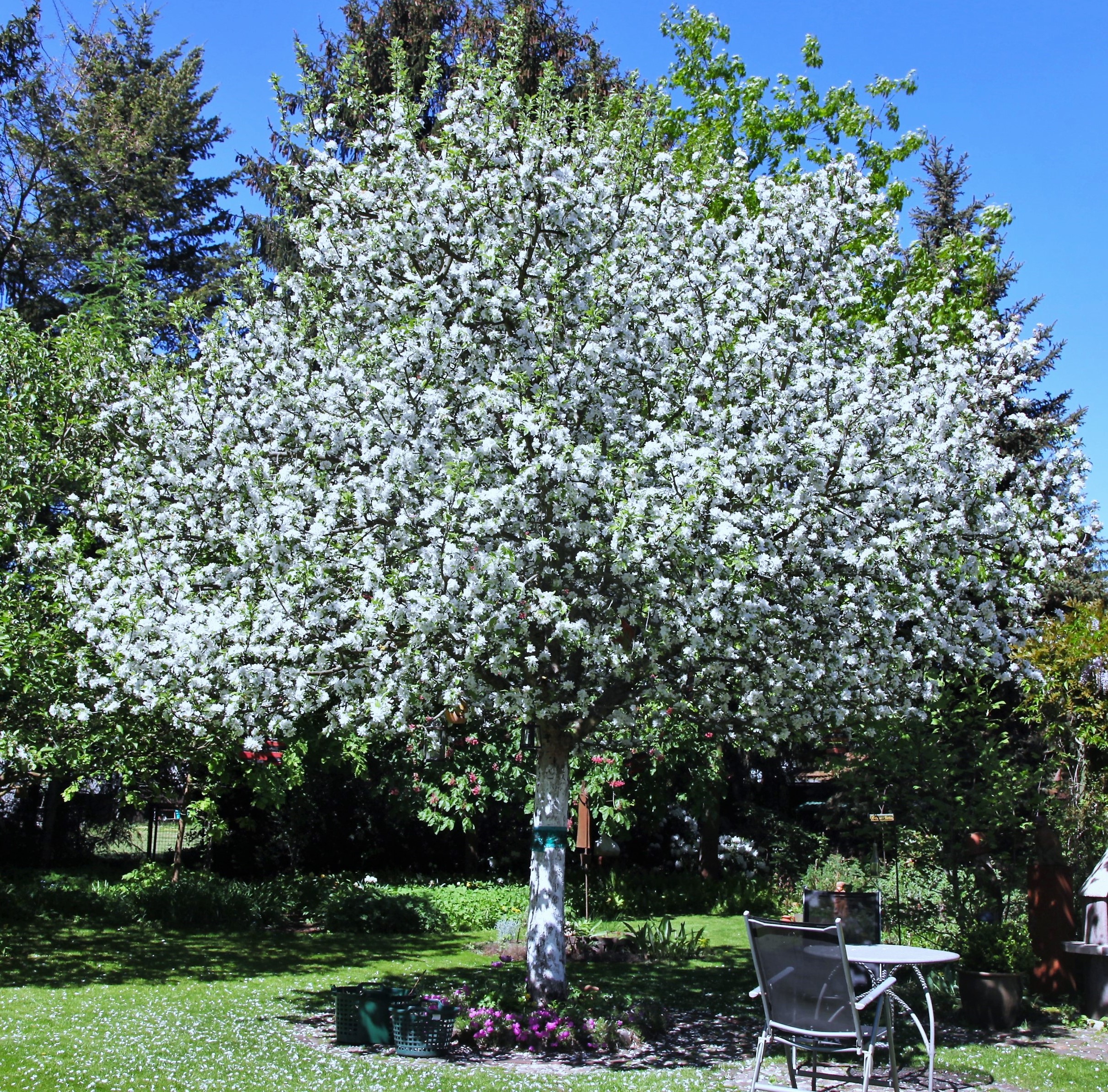 Unsere Apfelbäume sind inzwischen so groß geworden wie der alte Boskoop im Garten meines Großvaters. Und auch einen schattigen Sitzplatz finden wir unter dem Gewürzluiken-Hochstamm in unserem „Garten Eden“.
