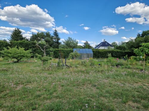 Bei hochsommerlichen Temperaturen waren wir in einen Edener Garten der besonderen Art eingeladen. Durch seine Lage bedingt, ist es ein “kalter Garten”, denn dort am Ende des östlichen Petscheltweges tritt im Frühjahr noch lange Bodenfrost auf. Der Garten hat kaum hohen Baumbestand und dadurch ist die Sonnenbestrahlung enorm hoch. Auch ist der Boden hier sehr karg.