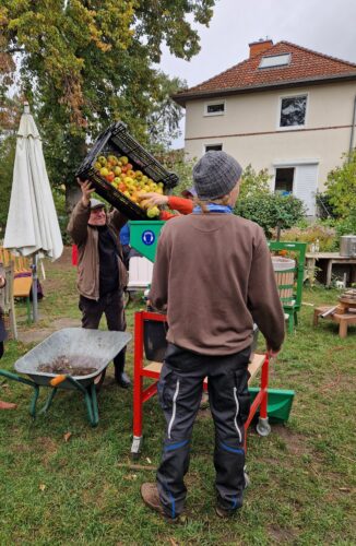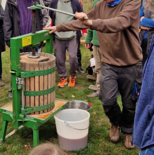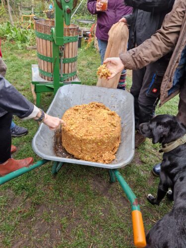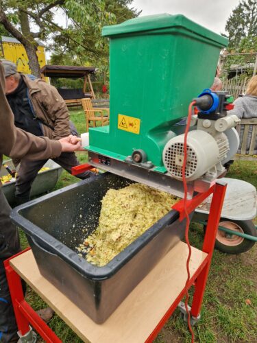 Das Highlight des Tages war dann das gemeinsame Pressen der mitgebrachten Äpfel. Es waren ausreichend Früchte für einen Durchgang vorhanden. Schließlich kamen gut 30 Liter Edener Apfelsaft dabei raus, der sehr süß (Zuckergehalt 15 %) und vollmundig war und sich in kräftiger Farbe zeigte. Wir hatten alle viel Freude dabei und kamen uns vor wie einst die Ur-Edener.